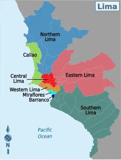 | Southern Lima A large area containing the districts of San Borja, Santiago de Surco, San Juan de Miraflores, Villa María del Triunfo, Villa el Salvador, Pachacamac, Lurín, Punta Hermosa, Punta Negra, San Bartolo, Santa María del Mar and Pucusana. |