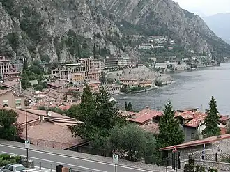 Limone is a town on the edge of Lake Garda. Sandwiched between looming rocky massifs over 1,000 meters high, with stunning views of the mountains above Malcesine on the opposite shore of lake, Limone is one of the most idyllically situated towns on Lake Garda. The narrow, stone-paved streets that wind their way between the high, stone walls of the ancient buildings, and a long promenade, fringed with cafes and restaurants, that culminates in a beach only add to the appeal, making it one of the most popular tourist destinations on the lake.