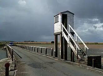 "Pilgrim's Way" was how folk got here before the road was built in 1954. Use the road to cross the creek to the "idiot box" — a cheat, as historically you had to wade across. The walking route then strikes off across the mudflats, clearly marked with tall poles. It takes a more direct line to the village bypassing the Snook, so the tidal portion is about 3 miles, and the tidal window is less than four hours. Allow two hours to cross, as it's slow going through the mud, and you must start it on a falling not a rising tide. There are two refuge platforms along the way, which you might ascend for the view.