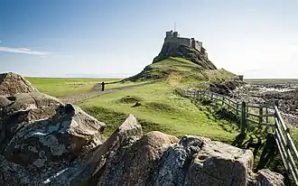 The Holy Island of Lindisfarne is a tidal island off the coast of Northumberland, reached by road causeway. It has an ancient priory, a castle tastefully decorated by Lutyens, and wildlife on its quiet sandhills. Officially it's just "Holy Island" but that's also the name of other places. In 2021 its population was 150, but on fine summer weekends when the tide is out it can feel like half of Newcastle is here.