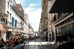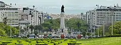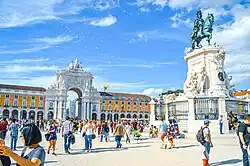 It's often said that Lisbon lacks a defined "downtown", but tourists will find most of their points of interest in the relatively compact area centered around the vast Praça do Comércio, facing the river. This is the starting point of the pedestrianized grid of Baixa (lower town), which immediately borders other historic quarters of Alfama, Chiado and Bairro Alto. Further northwest from Baixa stretches Avenida da Liberdade (Liberty Avenue), a broad boulevard resplendent in leafy trees, chic hotels and upmarket shops, terminating at the circular Praça de Marquês de Pombal. The financial centre, however, is further removed (hence the notion of "no downtown") up north towards the hills, and not directly connected to the historic districts.