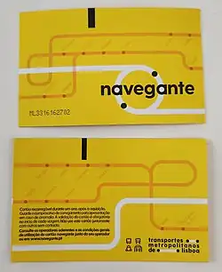 The best and, in many cases, the sole way to pay for city transport is by buying the rechargeable yellow "Navegante" smartcard. It's valid on the metro, trams (electricos), urban trains, most buses and ferries. The exception is buses not run by Carris—other bus companies have their own tickets. The card can be purchased for €0.50 (this price doesn't include any trips), and remains valid for a year.