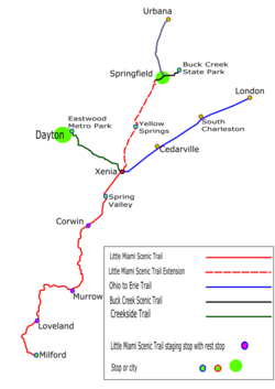 The bike trail was built atop of an abandoned railroad and connects Milford with Xenia, a distance of 50 miles, with several branch trails further connecting the main trail with other cities.