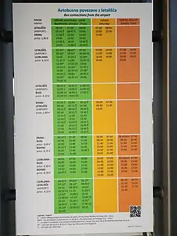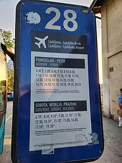 - Arriva Bus takes 50 min to the main bus and railway station ("Ljubljana AP", Stand 28), with several stops. It runs every 30 min M-F 05:20-20:10, and Sa Su holidays 06:10–19:10. The fare is €4.10, pay the driver on boarding; cannot pay with the city Urbana card. (May 2023)