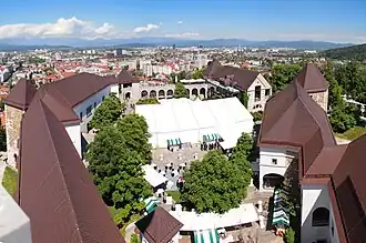 - 🌍 Strelec, Grajska planota 1 (Within castle), ☏ +386 31 687 648, strelec@kaval-group.si. Tu-F 18:00-23:00, Sa 12:00-22:00. This is within Archer's Tower of the castle, with a terrace overlooking the city. So you're paying for the great location but the food also scores.
