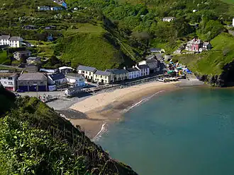 Llangrannog lies in the narrow valley of the River Hawen, which falls as a waterfall near the middle of the village.