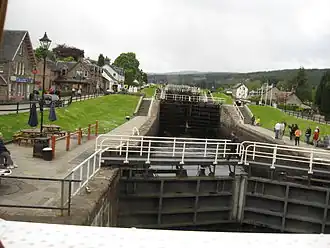 The Caledonian Canal is a coast-to-coast channel, built by Thomas Telford in the early 19th century, that makes use of the string of lochs and rivers along the glen. Commercially and strategically it was obsolete as soon as it was completed in 1822, as shipping had outgrown it, and round-the-coast navigation was much safer since the end of the Napoleonic wars. It fell into disrepair but was rehabilitated for pleasure craft. Loch Ness, its centrepiece, is the magnificent natural channel that doesn't need maintenance, but there are ladders of lock-gates at each end that very much do. At the south end the canal and River Oich feed in from Loch Oich, the highest part of the system; at the north end, canal and River Ness flow down from Dochgarroch Weir towards the sea at Inverness.