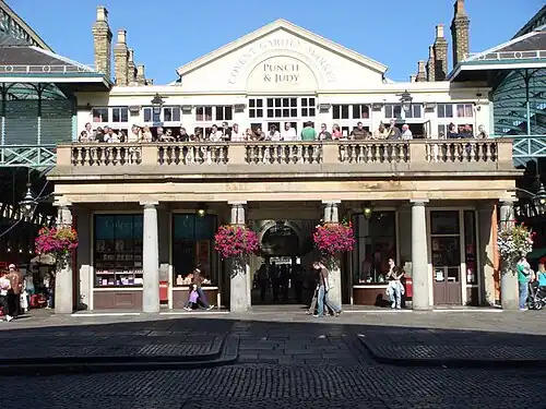 - π Covent Garden Piazza and Central Market (Tube: Covent Garden PIC ). Once an important working market, and the backdrop for the musical My Fair Lady, Covent Garden today is a covered shopping mall with shops predominantly selling clothing, but also gifts and cosmetics, as well as stalls selling handicrafts (Tu-Su) or antiques (M), and restaurants. It's well worth a visit just for the attractive ambience, with classical musicians busking in the lower part of the market and a famous location for street entertainers. There is a popular pub, The Punch and Judy Tavern at the western end, with a large balcony overlooking a square where street entertainers perform. At the eastern end, the corresponding balcony is occupied by Chez Gerard, a restaurant selling relatively-expensive but good continental cuisine. Most shops are open daily 10AM-7PM, but may close earlier on Sundays.