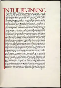 ![]() In 1905, the five-volume Doves Bible was finished it was printed on linen rag paper and remains a highly sought-after collector's item. In 1916, T. J. Cobden-Sanderson famously started throwing the metal blocks for Doves Roman (their custom serif typeface) into the River Thames from the Hammersmith Bridge. Several of these metal blocks are on display at the Emery Walker Trust museum from their recovery in 2014 when divers brought them up from the riverbed. |