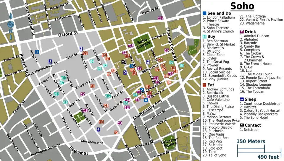 - Wander the streets. Soho is best discovered by wandering its streets. Take the less-trodden paths and you will be amazed by the rabbit warren of streets and the seemingly endless number of cafes, bars, shops and more. Some highlights are the gay village on Old Compton St, Soho Square and a tea and cakes in one of Soho's great patisseries.