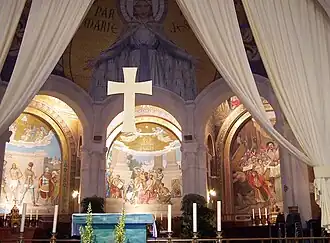 - 🌍 Basilica of Our Lady of the Rosary, 1 Avenue Mgr Théas, ☏ +33 5 62 42 78 78. Daily 05:00-00:00. A Byzantine style church finished in 1899. The nave, surmounted by a dome, contains the fifteen decades of the traditional Rosary. Surrounding the nave are each of the traditional mysteries of the Rosary (from left to right, Joyful, Glorious, and Sorrowful mysteries), each featuring a mosaic incorporated with smaller images of related themes and Latin scripts. A mosaic of Mary, whose appearance is based on Bernadette's depiction, can be seen in the upper wall of the sanctuary and written Par Marie a Jesus which means "From Mary to Jesus".