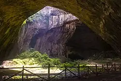 - 🌍 Devetashka Cave (Деветашката пещера, Devetashkata peshtera) (16 km (9.9 mi) north-east of Lovech, on the southern side of National Road 301, which leaves Lovech towards Levski and the E83/National Road 3; between the villages of Yoglav ('Йоглав') and Aleksandrovo ('Александрово'); there's a small road branching south-east and a free parking lot). Summer (Apr-Sep?): 08:00—20:00; winter (Oct-Mar?): 09:00—16:00. Large, open karst cave (the ceiling reaches more than 60 m (200 ft) in height in some places), named after the nearby village of Devetaki ('Деветаки', Devetashkata peshtera = "the cave of Devetaki"). It was inhabited by cave people during the neolithic age, then used by the military to store fuel during the Cold War, now it's a protected habitat of endangered birds and bats. Some scenes of the 2012 action movie The Expendables 2 were filmed there. Adults: 3 лв, various discounts apply.