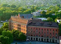 - 🌍 Former Hotel Oktiabr'. Now renamed as "Ukraine" (Пам'ятник архітектури Колишній готель Октябрь), Pushkina str.,(ул. Пушкина) 3. The most beautiful hotel was in Luhansk - "October." There were 173 rooms in the center Voroshilovgrad (now - Luhansk) building was originally called "Moscow". The brick facade made smartly and festive mood, its ornament created by all the rules tectonic organization. Vertical triangular pilasters of white silicate brick as lace, in contrast to the red wall generate rhythm, giving the facade of plasticity and severity.