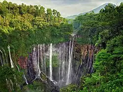 - š Kapas Biru Waterfall, Mulyoarjo, Pronojiwo. Waterfall cascading around 90 metres through red cliffs.