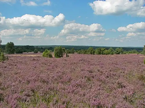The Lüneburg Heath forms a natural region within the North German Plain, with its own geography and climate. It is a vast expanse of pine and birch forests, open heathland, pleasant farmland, market towns and picturesque villages; stretching from the lazy waters of the River Elbe to the north, the pine-clad hills of the Drawehn to the east, the flat depressions of the River Aller to the south and Wümme to the west, and the low ridge guarding Hamburg's southern flank to the northwest. Ideal for walking, cycling or just chilling out, it has become a popular tourist destination, especially for the cities and large towns that lie nearby.
