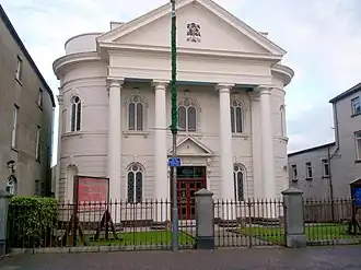 - Market Street is very wide, typical for a Plantation-era main street. It's mostly undistinguished low-rise but spare a glance for the Italianate Town Hall, and Shankill Parish Church (Church of Ireland) at the top of the vista.