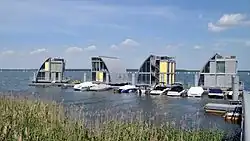 Several of the lakes are linked to each other via canals and some are open to motorized shipping whereas all are open to unmotorized watercraft. There are two passenger boats, both run by Reederei M. Löwa one is called "M.S. Santa Barbara", the other "Aqua Phönix".