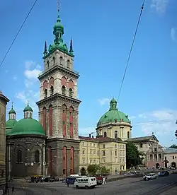 - 🌍 Saint George (Jura) Cathedral (Собор св. Юра), Sviatoho Yura sq (Святого Юра пл.,), 5 (SW). Built in 1363–1437 as a stone church in the Byzantine basilica style. The present Greek Catholic Cathedral was built in 1744–1770: it is a classic example of Baroque architecture of the period.