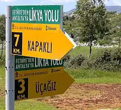 Signs, easily-recognizable, distinctive yellow arrows with the header Fethiye'den Antalya'ya Likya Yolu, "the Lycian Way from Fethiye to Antalya", are nowhere as frequent as the waymarks, but still can be seen, and indeed are useful, on most junctions (where for example trail branches off from a main road) and at village exits. They name the next destination on it with the distance in kilometres. The distances on signs are approximate, so don't worry if you see the distance going up or down by 1 km on the next sign.