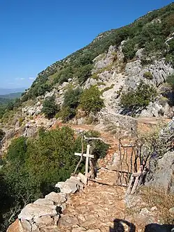 The trail immediately starts to twist and turn as soon as it enters the village, so watch the waymarks carefully. From this point on, you will always be descending until Faralya. After finding the right exit at the little maze between the garden walls in the village, you'll walk along a little valley with a dry creekbed in the middle and surrounded by fields and orchards. After passing two fountains in the valley, in addition to one inside the village, you'll start to quickly lose elevation towards Faralya on the side of a hill covered with shrubs. After climbing down some rocky terrain, with rocks lined like a gentle stair, you will suddenly arrive in a stream with a little waterfall which will welcome you to Faralya. Next to the waterfall is the hotel Die Wassermühle, converted from the old watermill of the village. You can quickly refresh yourself with the water, however it's best to keep adhering to leave-no-trace guidelines out of respect for the visitors of the waterfalls at the Butterfly Valley downstream.