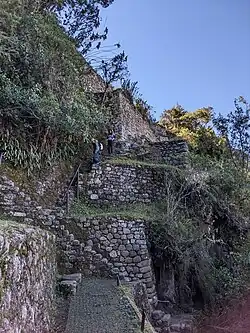 - 🌍 Machu Picchu Mountain – This is the mountain on which Machu Picchu is located and you can walk to the summit south of the ruins (3040m - Machu Picchu is at around 2,400-2,600m, Macchu Picchu Pueblo (Aguas Calientes) is at around 2,000m). Like Wayna Picchu you will have spectacular views, and it will cost you less. It used to have no entrance fee, but as of November 2017, tickets have to be purchased up front, just like for the site itself. Tickets can be purchased in advance, for one of two groups: 07:00-08:00 or 09:00-10:00. The path to Machu Picchu Mountain can be found along the path to the Sun Gate. Machu Picchu Mountain is among the least visited sites at Machu Picchu, which will give you the opportunity to get away from the tourist crowds. For the round trip you should plan on 2½-3 hours. Bring lots of water, as the hike is strenuous. You are not officially allowed to bring food, but may regret not having some snacks. Expect a hike similar to the one from Macchu Picchu Pueblo to the site in style, but longer, and with steeper steps. The trail is spectacular, even if you don't reach the summit.