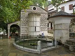 One of the most characteristic traditional settlements on mount Pelion. It is filled with mansions and houses from the Ottoman era that look like hanging ornaments on the green mountain side and are colorful (but not as Portaria). Many of these have been restored into restaurants and guesthouses. It sits on a slope of the Pelion range and another mountaintop to the east with forests, at a height of about 500 m (1,600 ft) above sea level. The square with age-old trees lends a panoramic view of Volos and the Pagasetic Gulf. In one of the traditional coffee houses there is a big fresco by the 20th century naïve folkloristic artist Theofilos. The picturesque cobbled paths of Makrinitsa are scattered with traditional water fountains. Makrynitsa, with a population of about 900 people, has a school, a lyceum, a church, a post office and a square (plateia) with tall trees.