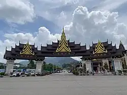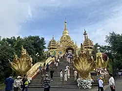 - 🌍 Menghuan Great Golden Pagoda (大金塔), Lei Yaran Mountain (at the top of Lei Yaran Mountain, 1079.6 meters above sea level, southeast of Mangshi), ☏ +86 692 3067555. 08:30-22:00. Menghuan Great Golden Pagoda is an iconic structure of Mangshi, located at the summit of Lei Yaran Mountain. The pagoda is about 76 meters tall, with an octagonal shape and four gates. It has three main halls and 16 smaller surrounding pagodas. Visitors can worship inside the main hall and enjoy the surrounding scenic views. The pagoda is open daily from 08:30 to 22:00, with an entry fee of ¥40. ¥40.