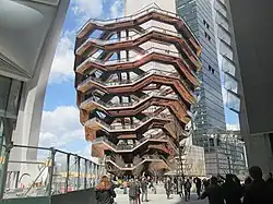 πVessel,20 Hudson Yards(in Hudson Yards area; Subway: 7 to 34 StβHudson Yards),β +1 332-204-8500,vessel@hudsonyardsnewyork.com.10AMβ9PM, daily.Re-opened in October 2024 with steel-mesh safety nets and an unusual rule: No solo visitors. Plan to bring a friend when you visit this 16-story honeycomb-like structure at the core of the new Hudson Yards development project on Manhattan's West Side. Its 154 flights of stairs and 80 landings offer great views of the surrounding area, the Hudson River, and the structure's intricate framework. Buy admission tickets online in advance. Elevator service is available to three floors, usually with a long wait. No baby strollers, bicycles, skateboards, food, pets, or emotional support animals.$10β15.(updated Oct 2024)