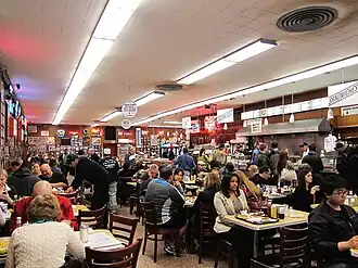- π Katz's Deli, 205 E Houston St (at Ludlow), β +1 212-254-2246. A classic NYC delicatessen. The famous fake orgasm scene in When Harry Met Sally was shot here. Have what she was having: A pastrami sandwich. If you're a pastrami lover, you will long remember your trip to this establishment. Don't lose your ticket, and don't forget to tip the counterman at least $1 per sandwich. If you want something other than pastrami, their corned beef and brisket vie for second best and even their turkey is fine (though it's probably not what you're there for); make sure to ask for anything "juicy" (i.e., fatty).