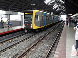 Manila is served by LRT Line 1 (green line), operated by Light Rail Manila Corporation, LRT Line 2 (blue line), operated by the Light Rail Transit Authority, and MRT Line 3 (yellow line), operated by Metro Rail Transit Corporation. Line 1 uses light-rail type rolling stock and serves Malate, Ermita, Quiapo, Binondo and Santa Cruz. Line 2 uses longer commuter-grade rolling stock and serves Quiapo, Sampaloc and Santa Mesa. Line 3 uses light-rail type rolling stock and connects with Line 1 and Line 2 at Taft Avenue and Araneta Center–Cubao stations, respectively.