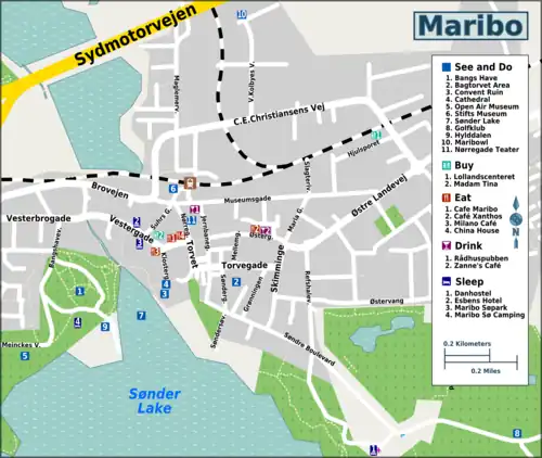 - 🌍 Hotel Maribo Søpark, Vestergade 29 (in the middle of the main street), ☏ +45 5478 1011, fax: +45 5478 0522, info@maribo-soepark.dk. Hotel with a view of Sønder Lake. Offers 107 rooms, most of which have a balcony. Restaurant and spa available. Doubles from 1,025 kr.