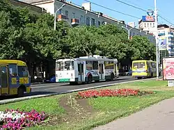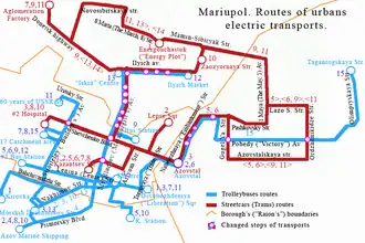 Include: bus transportation, trolley-buses (14 routes), trams (12 routes) & fixed-route taxis. Install the App "City Bus Mariupol" which shows all buses and minibuses in real time. (10/2019)