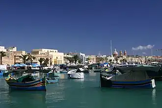 Marsaxlokk is a picturesque fishing village on the south-east side of Malta; it has an ancient history, being the site of a Roman temple dedicated to the goddess Juno, but no ancient remains are visible. It is rare as a Maltese seaside village in that it has no modern buildings such as hotels spoiling it and none of the traditional housing has as of yet been destroyed to make way for prefab rental apartments. On Sundays there is a fish market where one can get the best fish available, a particular local favourite is the Lampuki. The sight of the traditional luzzu's (fishingboats built according to a design dating back to the Phoenicians) and the tranquil surroundings make this a very pleasant place to have lunch at one of the quayside restaurants. The only blemish on this near perfect picture is the power plant that for some unfathomable reason had to be built on the side of the bay rather than out of sight in the next bay where the ultra modern cargo port is located.