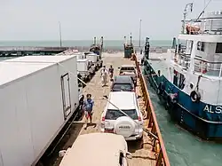 The National Ferry Company runs regular vehicle ferries from 🌍 Shanna'a (or Shannah, tel. +968 2521 6161) on the east coast of the mainland, which take about 1½ hours to arrive in 🌍 Hilf Port (tel. +968 2550 4884). The ferries are old converted tank landing craft, and run four times daily from 09:00 until 18:00 but only at high tide (the waters are very shallow). Passengers one way: OMR 3/1.50 (adult/child); cars one way: OMR 16/20 (passenger car/4WD)
