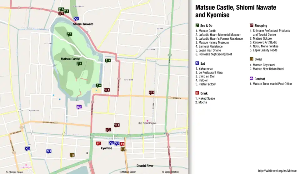 - 🌍 Shiomi Nawate (塩見縄手). This old samurai residential street runs along the north east side of Matsue Castle, across the moat. Many of Matsue's musea and other historical attractions can be found in this area.