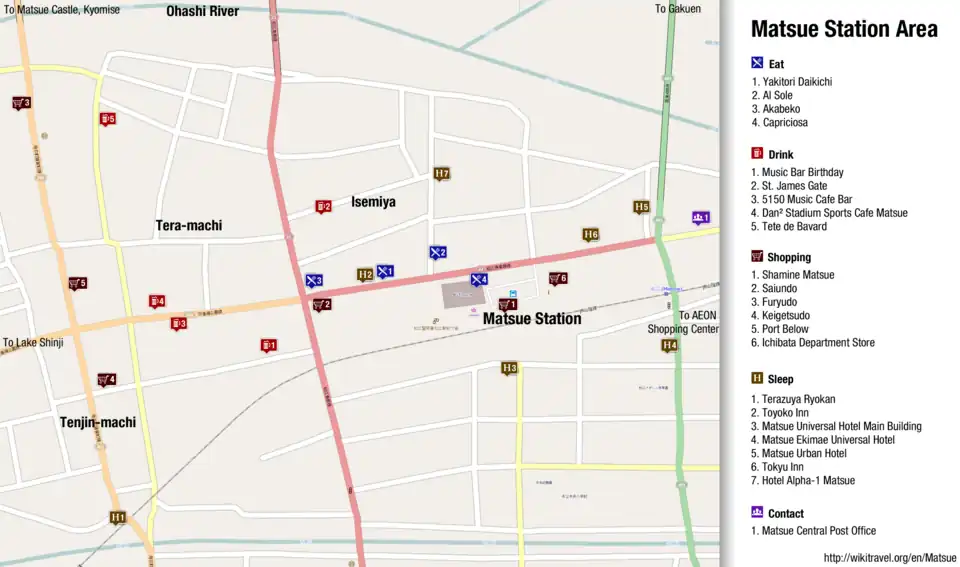 - 🌍 Matsue International Tourist Information Center (松江国際観光案内所), 665 Asahimachi (Just north of Matsue Station), ☏ +81 852-21-4034. Has maps and pamphlets in English and can offer advice on what's happening around town.