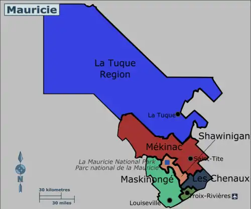 The Mauricie region of Quebec stretches from the north shore of the St. Lawrence River, about halfway between Montreal and Quebec City, deep into the Laurentian Mountains. Populated by French settlers under the seigneurie system in the 17th and 18th centuries, it has some of the oldest towns and villages in Quebec. The St. Maurice River, which gives the region its name, has its source in the Gouin Reservoir, then meanders through Mauricie to its mouth at Trois-Rivières.