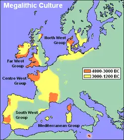 The megalithic cultures were prehistoric communities that erected megaliths in Europe and parts of the Middle East during the Neolithic or New Stone Age period. That began with the Neolithic Revolution, when people developed agriculture and settled near their crops, starting about 10,000 BC in the Fertile Crescent but later in other areas.