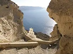 Megalochori (Greek: Μεγαλοχώρι) is a very quiet traditional village sitting on a hill facing to the east in the heart of Santorini. The roads narrow frighteningly for a nervous passenger as you get closer to the village. There is a central square with a couple of tavernas. There are numerous wine tasting places here and indeed this village is at the heart of the island's wine industry. The vineyards are located all round the village, the vines coiled in a typical Santorini fashion. The village itself has a nice mixture of cream and white Cycladic houses with contrasting colourful wooden doors and a fair few white churches with bright blue domes for good measure. There are a couple of tiered bell towers over the road as you approach the square.