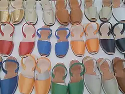 Avarcas, the traditional Menorcan sandal, is available in shops and markets throughout the island. They are now a fashion icon and can be found around the world, but were originally designed as a shoe for farmers. Only the original Avarca manufacturers are allowed to sell shoes with the label "Avarca de Menorca". This is only given by the local Balearic Government as a guarantee that the avarcas accomplish minimum quality standards and that they have been really manufactured on the island.