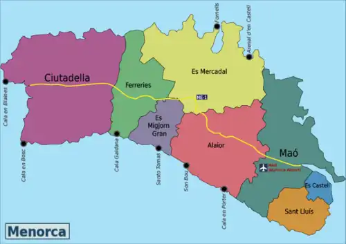 The island is split into eight administrative divisions: Maó, Es Castell, Sant Lluis, Alaior, Es Mercadal, Es Migjorn Gran, Ferreries and Ciutadella. Each division is responsible for the beaches and resorts within it.