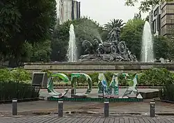 - 🌍 Fuente de Cibeles, Av. Oaxaca, Plaza de Madrid, Roma Nte.. Roundabout on a wide avenue featuring a large fountain with a replica of a famous statue of a goddess in Madrid. The fountain is a gathering point for the Spaniard ex-pat community who come to celebrate Spanish soccer victories and similar events. The nearby tree-lined streets are full of restaurants and lively pubs.