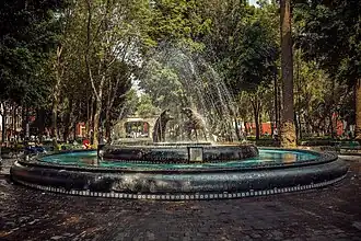 In the general center of Coyoacán there is a pair of large squares, 🌍 Plaza Hidalgo and 🌍 Jardín Centenario, which together are the center for a lot of the activity in the area. On Saturdays and Sundays, there's an open-air market in the squares, mostly focusing on arts and crafts, clothes (a lot of tie-dye and T-shirts), piercings and tattoos. With a bit of selectivity, and some haggling, you can pick up a lot of interesting things here, and none of them are horribly touristy or tacky. There are also impromptu African dance performances, Aztec dancers, fortune tellers, and lots more to see. The market square is surrounded by cafes and restaurants, as well as a small 16th century church and a small public library. In the smaller streets nearby are even more cafes and restaurants, as well as stores selling antiques, clothes, crafts, and so on.