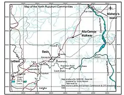 All the minibuses that ply the Linden-Lethem road stop here to cross the Essequibo River by ferry. Michelle's mobile is ☏ +592 6395716. Normally the driver of your minibus knows Michelle and can call her to meet you. In the dry season the island is connected to the mainland, in the wet season you need the owner's boat to reach it.