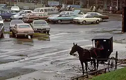 In 2005, Wal-Mart opened a Supercenter in the village. In order to cater to the local Amish population, the Supercenter has an expanded parking lot that includes 37 hitching posts for Amish buggies, and the store is stocked with blocks of ice and fabrics for clothes to be made at home