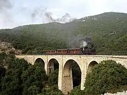 Milies, Vizitza, Pinakates (Greek: Μηλιές, Βυζίτσα, Πινακάτες) are villages in municipality of South Pelion on Mount Pelion in Greece. Since these villages are close to each other, they are considered as a single travel destination. As a tourist destination belongs to Northwest Pelion. It is a traditional Greek mountain village, at a height of 400 m. It is 28 km from Volos, the capital city of the prefecture of Magnesia. Milies is connected with the GR-34A (Volos - Promiri) It has traditional stone houses, cobbled roads, good restaurants and accommodation in abundance. Milies is also notable for being the terminus of the narrow gauge (60 cm) Pelion Railway, built by the Italian engineer, Evaristo de Chirico, (father of the famous painter) between 1895 and 1903. This proved to be of considerable economic advantage to the region. The village commands striking views across the Pagasitikos Gulf and benefits from the many streams and water sources that Mount Pelion is renowned for. These result in rich vegetation and cool, forested mountain slopes.
