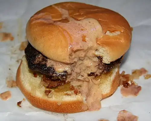 Traditional foods associated with Minnesota, including hotdish (casserole) and lutefisk (a Norwegian fish delicacy) are rarely found in restaurants. However, one uniquely Minneapolitan item that can be easily located is the Juicy Lucy (sometimes spelled Jucy Lucy), a cheeseburger variation in which the cheese is cooked inside two molded-together meat patties rather than on top. The cheese inside the burger is gooey and piping hot. While the origin, and spelling, of the Juicy Lucy is disputed, popular places to order a Juicy Lucy include Matt's Bar and the 5-8 Club in South Minneapolis, and a short distance across the river in Saint Paul at the Nook, among others.