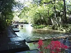 - 🌍 Genpei River (源兵衛川) (Just south of the station on a sidestreet running east-west across the main road. Alternately, the southern exit of Rakuju-en, with the turnstyle, leads right onto it.). 24hrs. The Genpei is a little stream right in the middle of Mishima city made of the springwater of Mount Fuji. It's shallow, clear and cold so children often play in it. Some Japanese killifish (めだか), minnow (ハヤ), crabs (沢ガニ), pond snails (タニシ) and fireflies (蛍) inhabit the stream. The city has restored parts of its waterways with stepping stones, waterwheels, little models and other such stuff to try and evoke a nostalgic feel. Free.