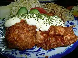 Miyazaki is famous for its "Chicken Nanban" dish. The basic dish consists of fried chicken topped with tartar sauce. It is typically coupled with salad or spaghetti. The other famous food in the city (and prefecture) is mangoes. When in season, you can purchase whole mangoes at markets, but there are also restaurants that serve mango parfaits and desserts for you to try.