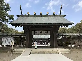 - 🌍 Miyazaki-jingū (宮崎神宮). A shrine in the city's center, sacred to Japan's first emperor, Jinmu. There are two shrines in the place: one is the main shrine on the east side, and the other one is the Miyazaki Gokoku Shrine (宮崎縣護國神社) on the west side. The Miyazaki Gokoku Shrine, sacred soldiers who died in World War II, is much smaller than the main one. A path between the two shrines can lead visitors to the Miyazaki Prefectural Museum of Nature and History.